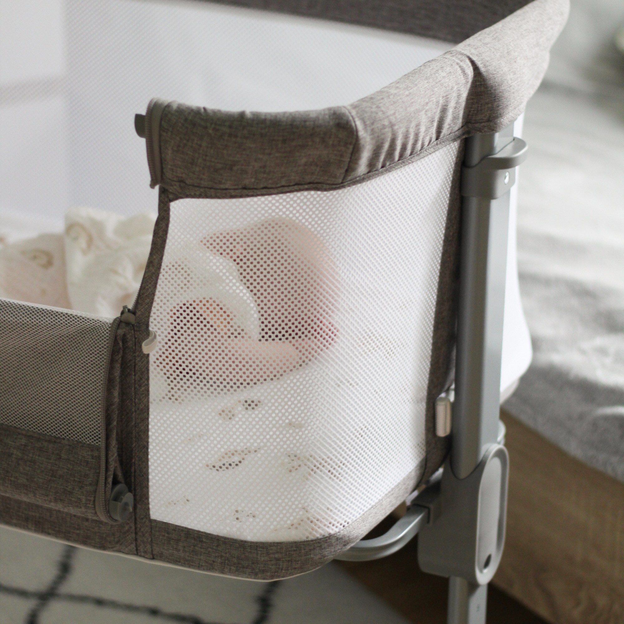- Priloženi so posebni nastavljivi trakovi za povezavo otroške posteljice s posteljo staršev
