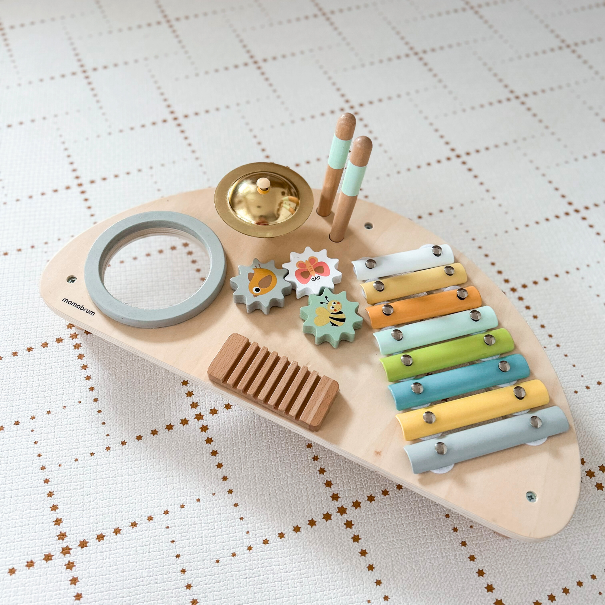 Leseni glasbeni center spodbuja ustvarjalno igro. Vključuje mini bobne s paličicami, ksilofon, vrtljive zobnike s pisanimi žuželkami in še več! Igrača otrokom zagotavlja obilo zabave, hkrati pa spodbuja učenje novih spretnosti, izboljšuje koordinacijo oči in rok ter ročno spretnost. Malčkom omogoča, da prevzamejo vlogo glasbenih virtuozov. Morda bo v vašem malčku prebudila novo strast!