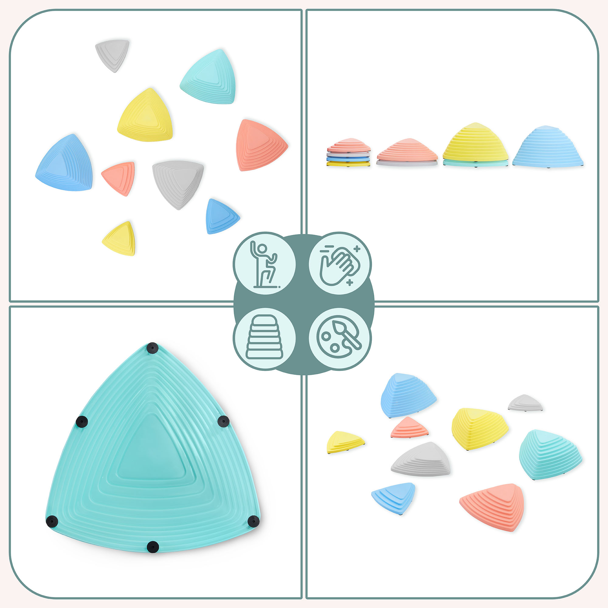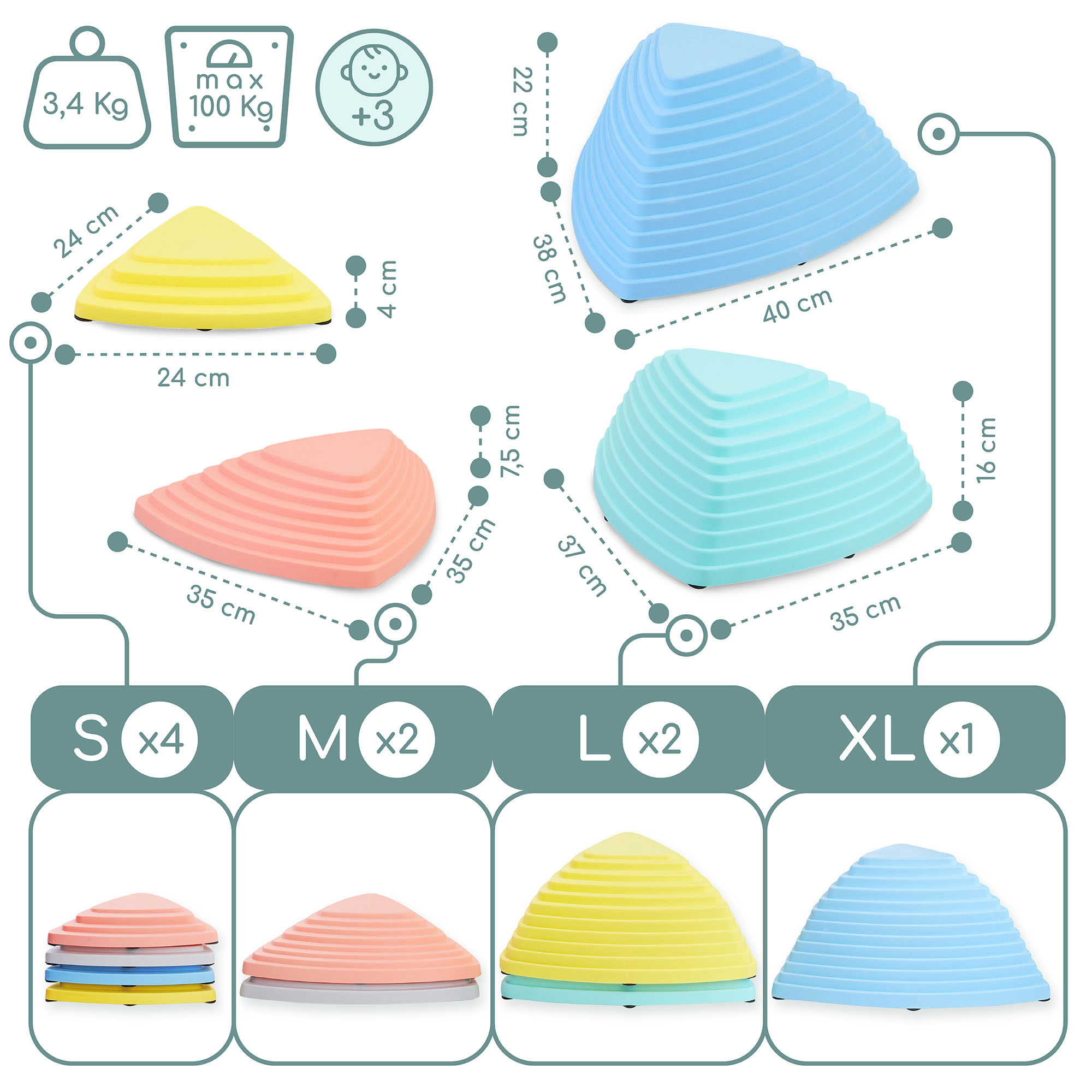 Komplet ravnotežnih kamnov vsebuje 9 kosov različnih velikosti in barv. Preprosto jih postavite na določeni razdalji drug od drugega in tako malčku zagotovite zanimivo zabavo. Balansiranje na zaporedju kamnov je odlična vadba za ravnotežje in gibalno koordinacijo. Komplet je odlična izbira ne le za dom, temveč tudi za otroško sobo ali sobo za rehabilitacijo.