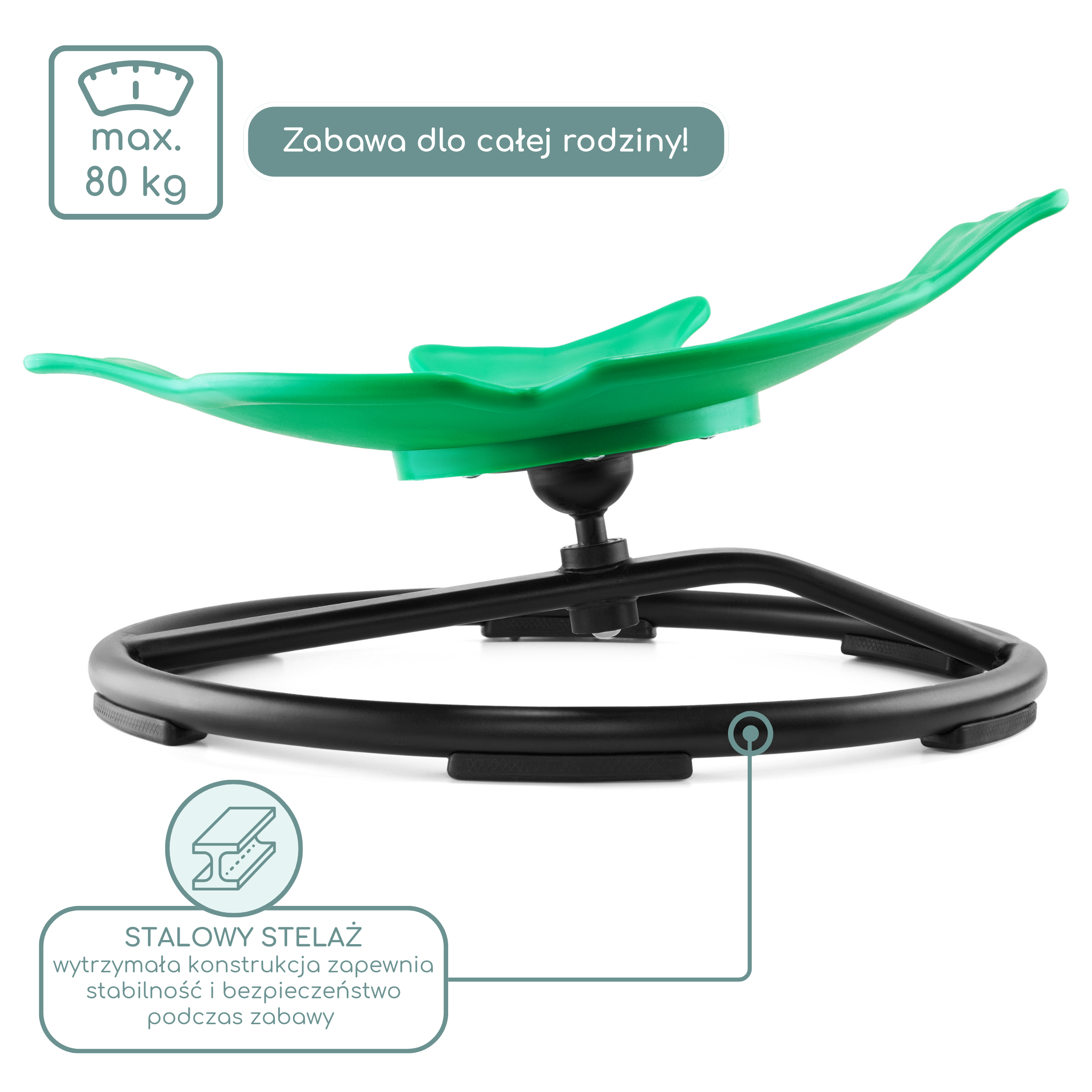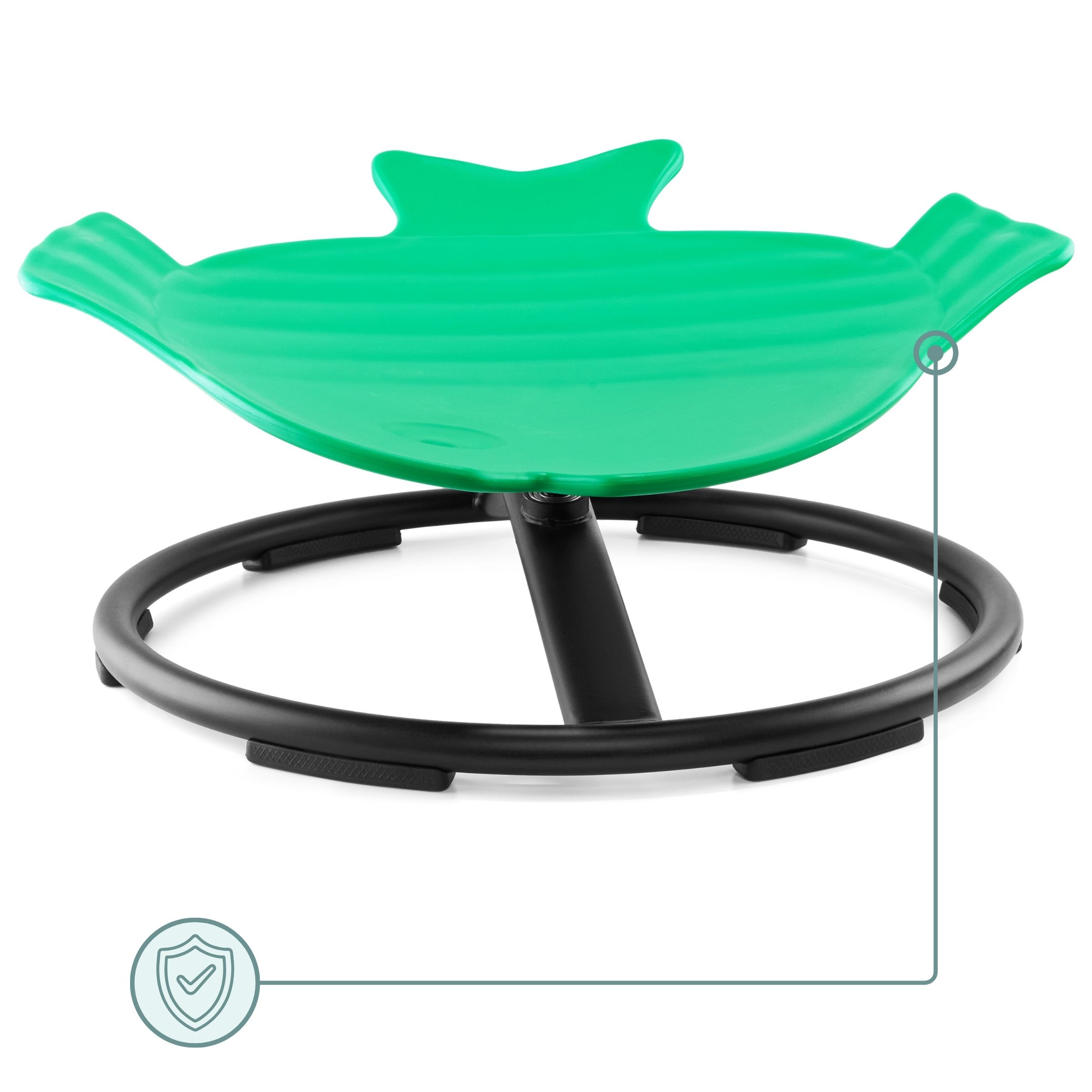Debeli robovi sedeža omogočajo otrokom trden oprijem, kar povečuje njihovo varnost med igro. Kovinski okvir zagotavlja stabilnost in trdnost konstrukcije, gumijaste podlage pa preprečujejo, da bi mini vrtiljak drsel po tleh. Sedež, izdelan iz plastike, je ustrezno oblikovan, da so otroci med vrtenjem v udobnem in stabilnem položaju.