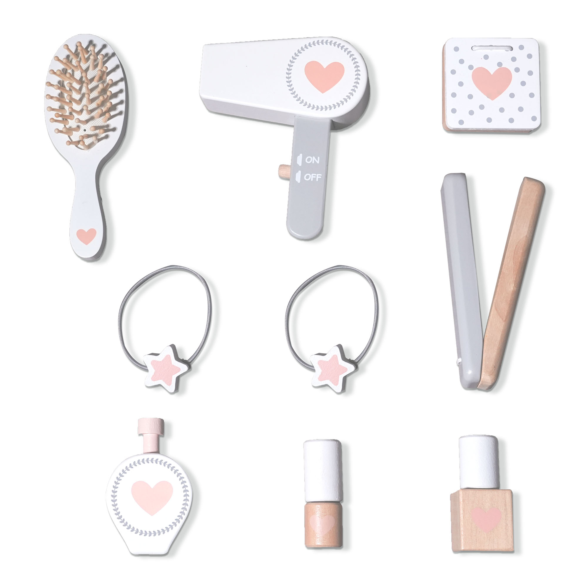 - Vključenih je do 9 dodatkov: krtača za lase, sušilec za lase, senčilo za oči, 2 elastiki, ravnalnik las, parfum, lak za nohte, šminka