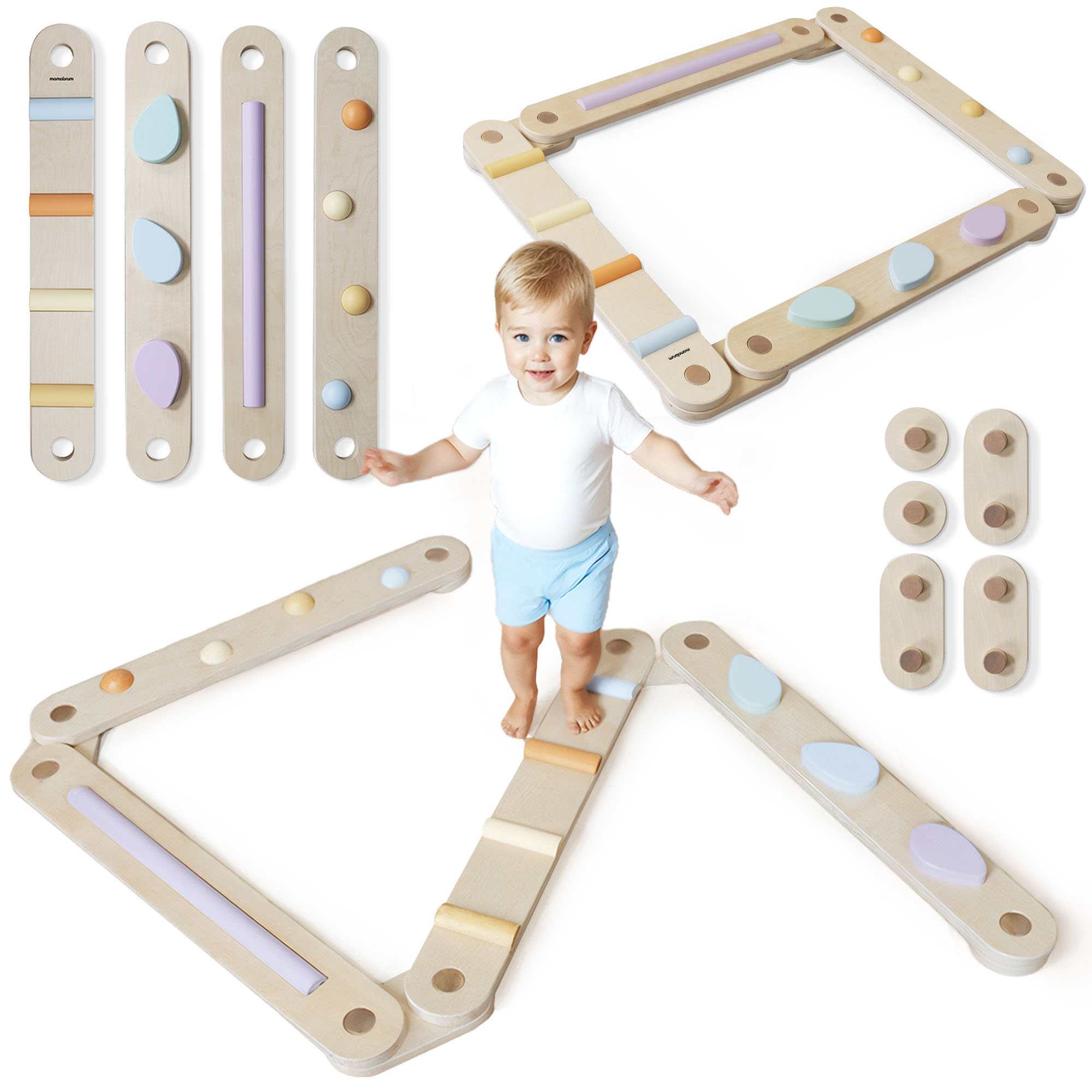 Zaradi velikih dimenzij nosilcev steza ni le stabilna, temveč tudi udobna za uporabo - otrok ima dovolj prostora, da lahko varno dela korake, vadi ravnotežje in razvija samozavest. Ko je igranja konec, lahko elemente enostavno razstavite in jih shranite v kompaktni obliki.