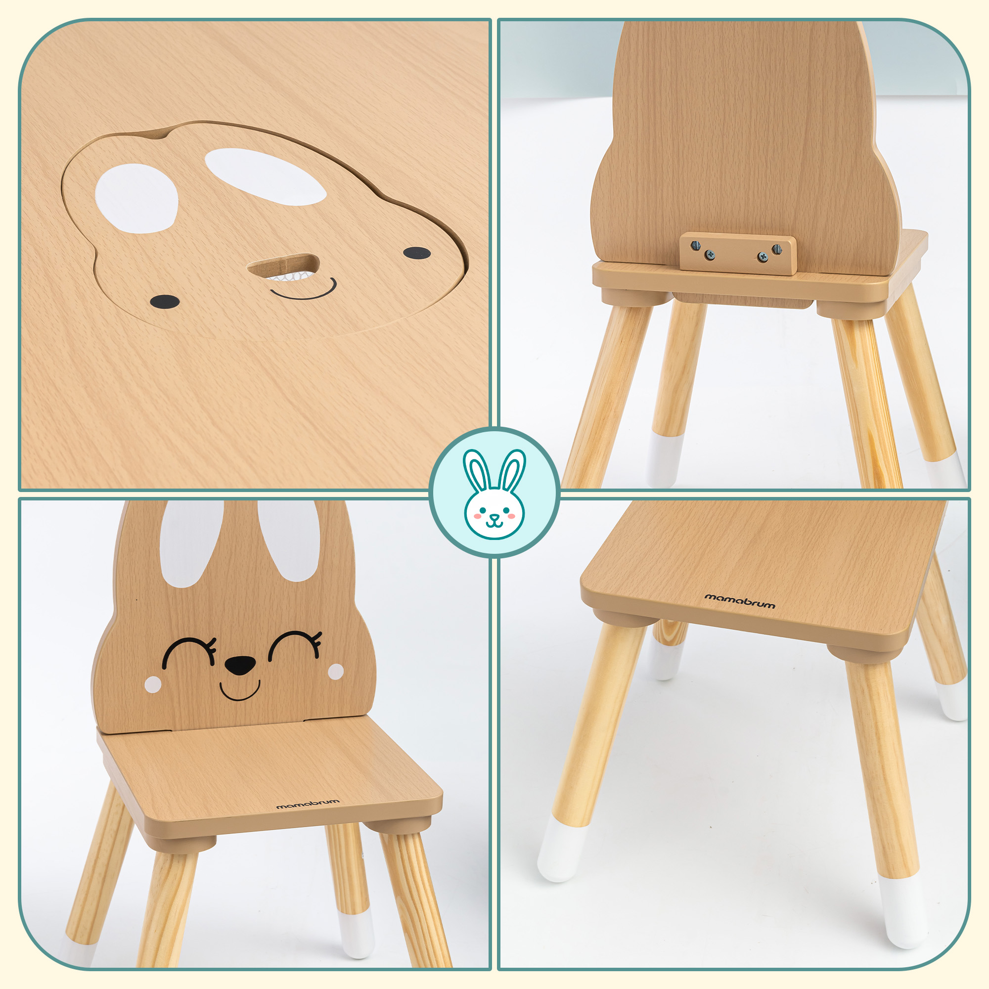 Komplet ni le vizualno privlačen, temveč tudi razvija otrokovo samostojnost. Miza s shranjevalnim prostorom pomaga ohranjati urejenost , stoli z zajčjim naslonjalom pa spodbujajo skupno preživljanje časa za mizo. Zaradi ustrezne višine sedeža (26,5 cm) je pohištvo udobno in varno za mlade uporabnike.