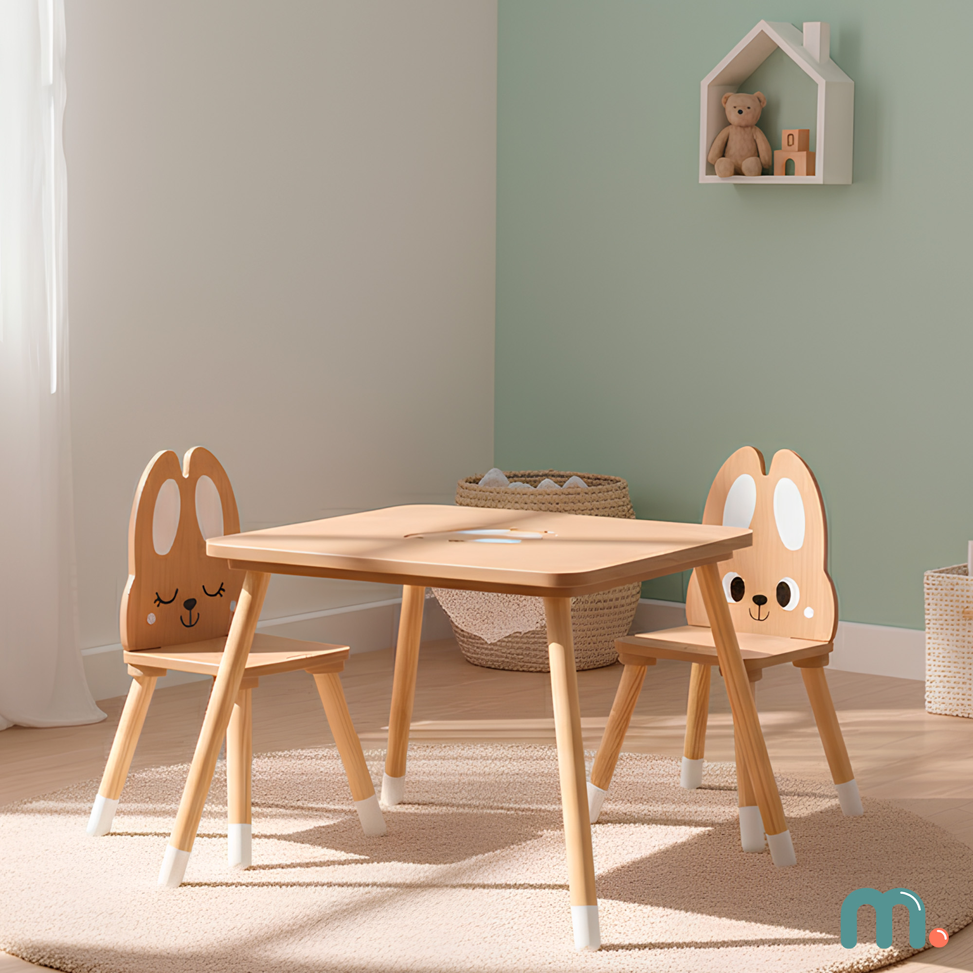 Ustvarite prijeten prostor za svojega otroka, kjer lahko vsak dan postane nova pustolovščina! Komplet mizice in stolov Charming Rabbit združuje edinstveno obliko, funkcionalnost in trdno izdelavo . Lesena miza s centralnim shranjevanjem in dva stola v obliki zajca ustvarjata popoln prostor za risanje, učenje, prehranjevanje ali skupno igro.