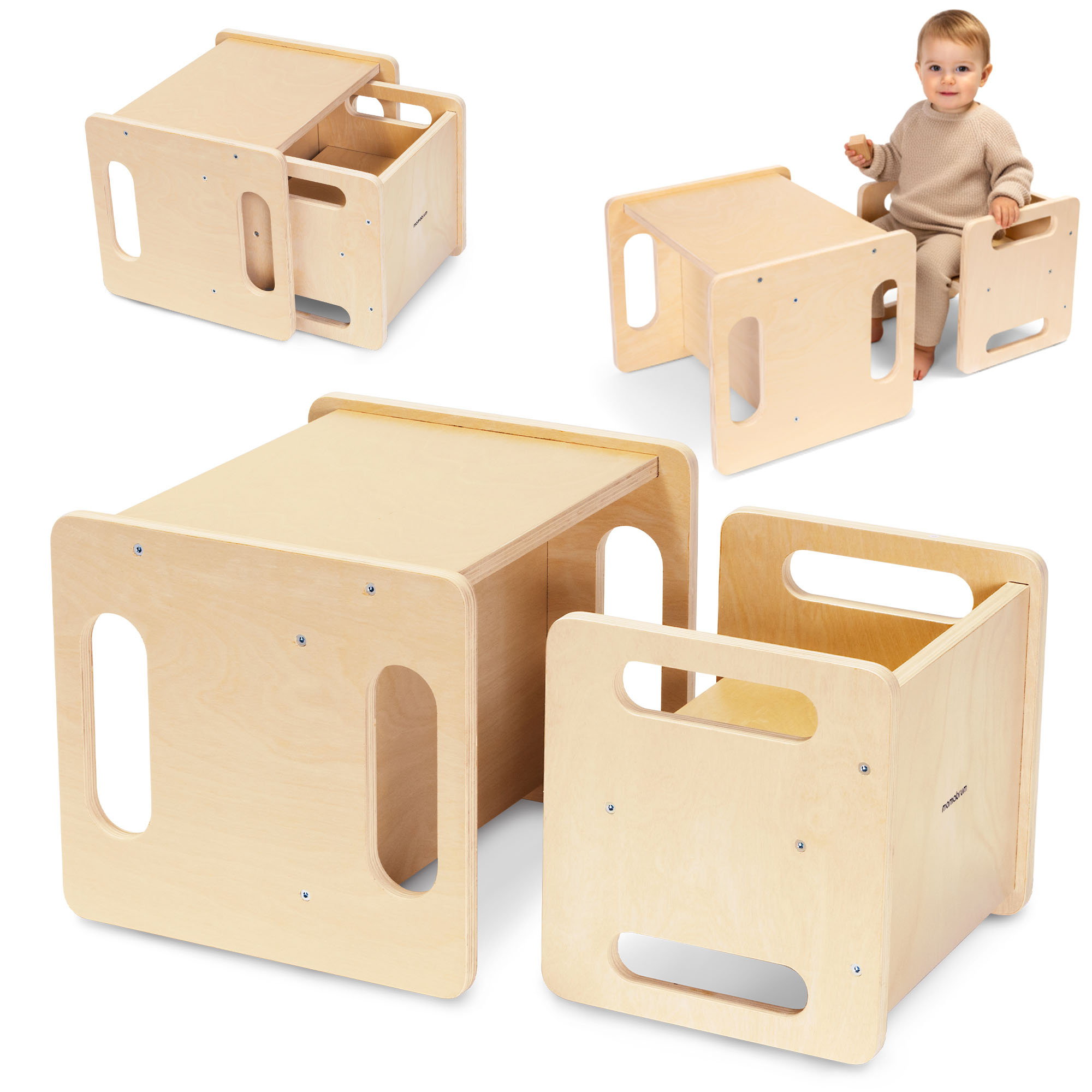 Ta pameten komplet otroškega pohištva združuje šest praktičnih načinov uporabe , ki jih je mogoče prilagoditi starosti in potrebam vašega malčka. Z enostavnim obračanjem delov se miza iz nizke mize spremeni v visoko mizo, stol pa se iz klasičnega sedeža spremeni v udoben stolček. Poleg tega se oba kosa lahko uporabljata kot odskočna deska, ki spodbuja otrokovo neodvisnost v skladu s filozofijo Montessori.