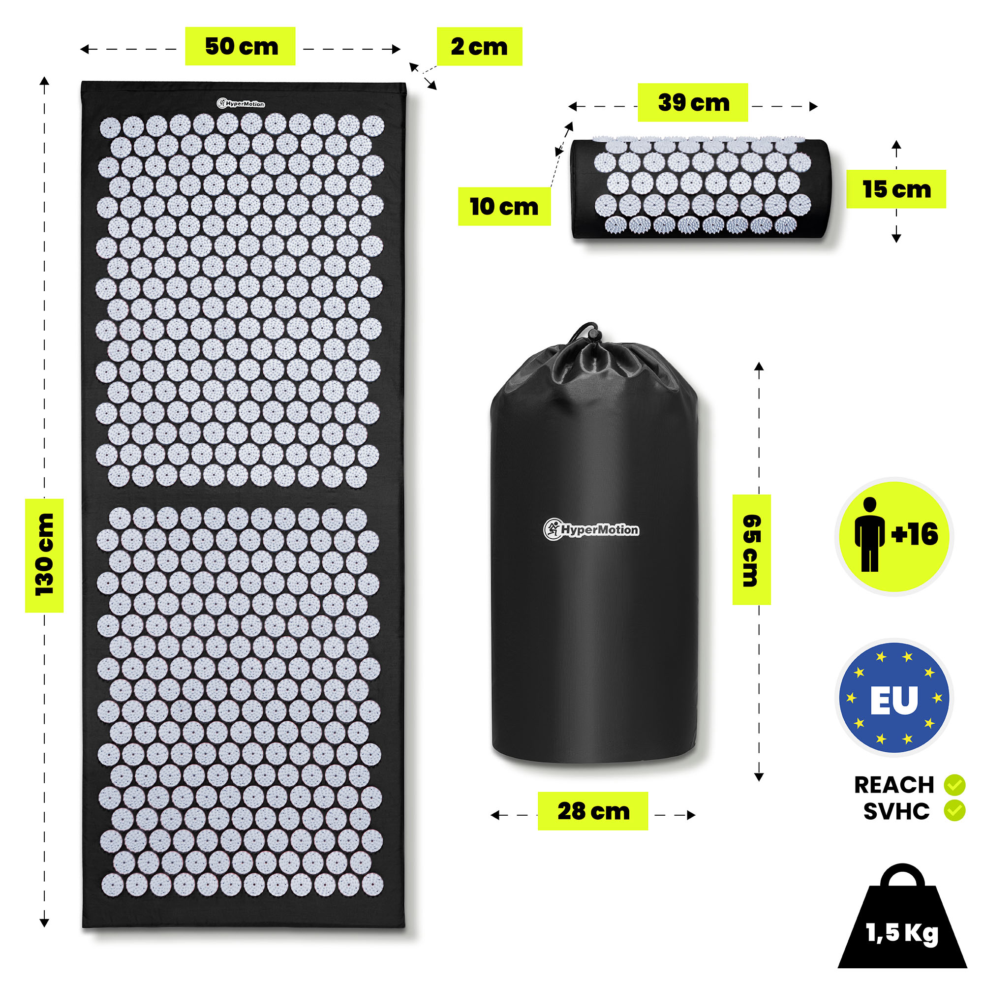 Akupresurna podloga HyperMotion v velikosti XL (130 cm) zagotavlja široko površino, ki omogoča udobno stimulacijo hrbta, vratu, rok, zadnjice in nog v eni sami seji. Redna uporaba podpira naravne procese sproščanja telesa, pomaga zmanjšati mišično napetost in ustvarja ugodne pogoje za umiritev in okrevanje po stresu ali naporu. Akupresurne konice so izdelane iz trpežne ABS plastike z varno zaobljenimi konicami – ta material je odporen na deformacije, stabilen na pritisk in prijazen do kože, kar omogoča natančno, a udobno stimulacijo površinskih točk. Podloga je primerna tako za vsakodnevno sprostitev kot tudi kot del domače zdravstvene oskrbe, saj spodbuja dobro počutje in splošno telesno udobje.