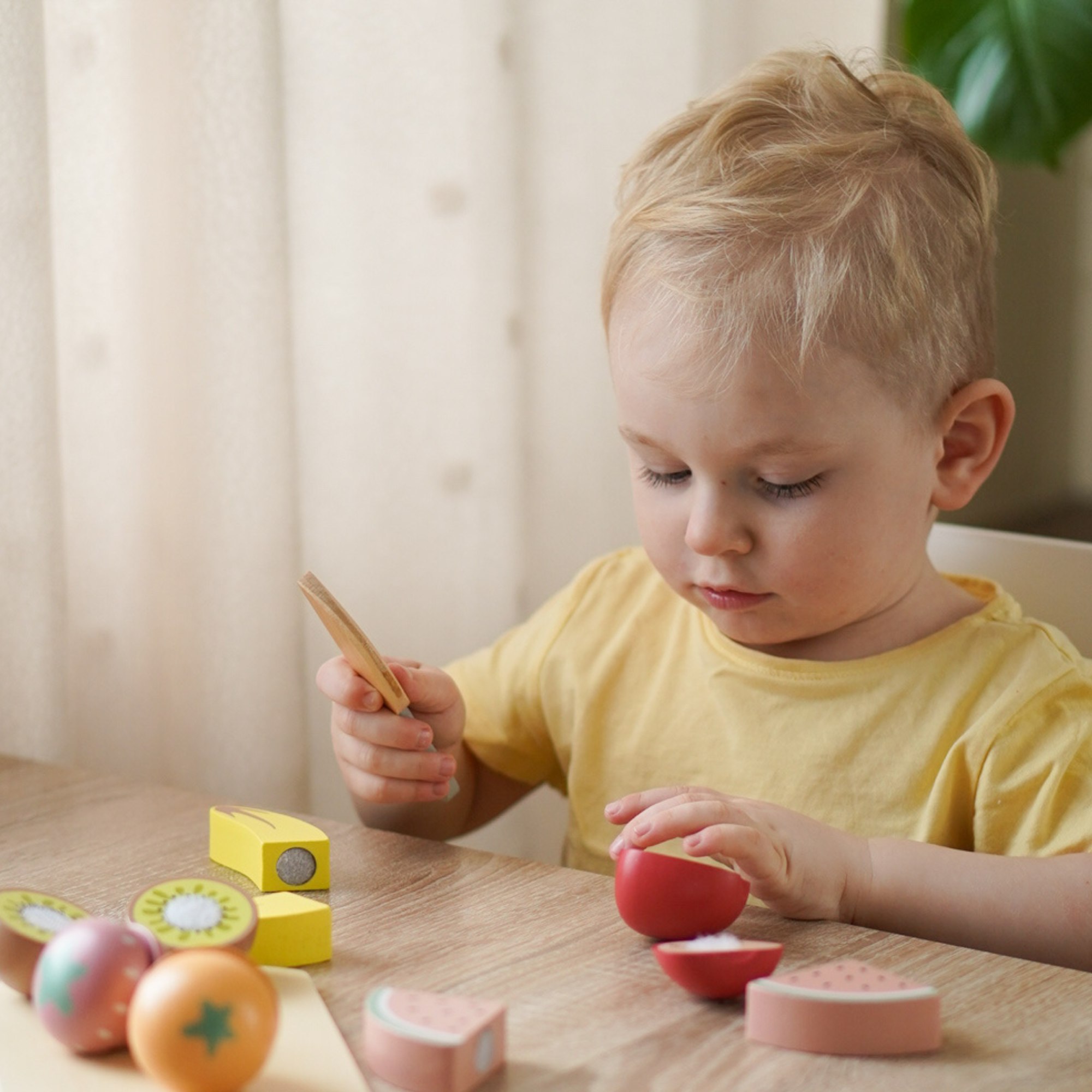 Vsak sadež lahko z lesenim nožem enostavno "prerežete" na pol. Zahvaljujoč močnim zapiralom na velcro, jih lahko malček zlahka spet sestavi skupaj. Ta igrača bo otroku omogočila, da prevzame vlogo malega kuharja in pomaga staršem pri pripravi obrokov. Rezanje sadja na leseni deski pomaga tudi pri izboljšanju otrokovih ročnih spretnosti.